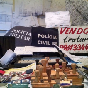 Durante a execução do mandado de busca na casa do acusado, foram encontrados documentos referentes à compra e venda de imóvel, a lotes no distrito de Praia Grande, bem como diversos carimbos falsos de cartórios e de órgãos relacionados à certificação de diplomas.