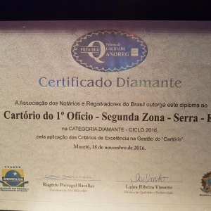 O Cartório do 1º Ofício 2ª Zona da Serra/ES recebeu pela segunda vez a premiação máxima: o selo Diamante, resultado da busca pela excelência nos serviços prestados aos usuários.